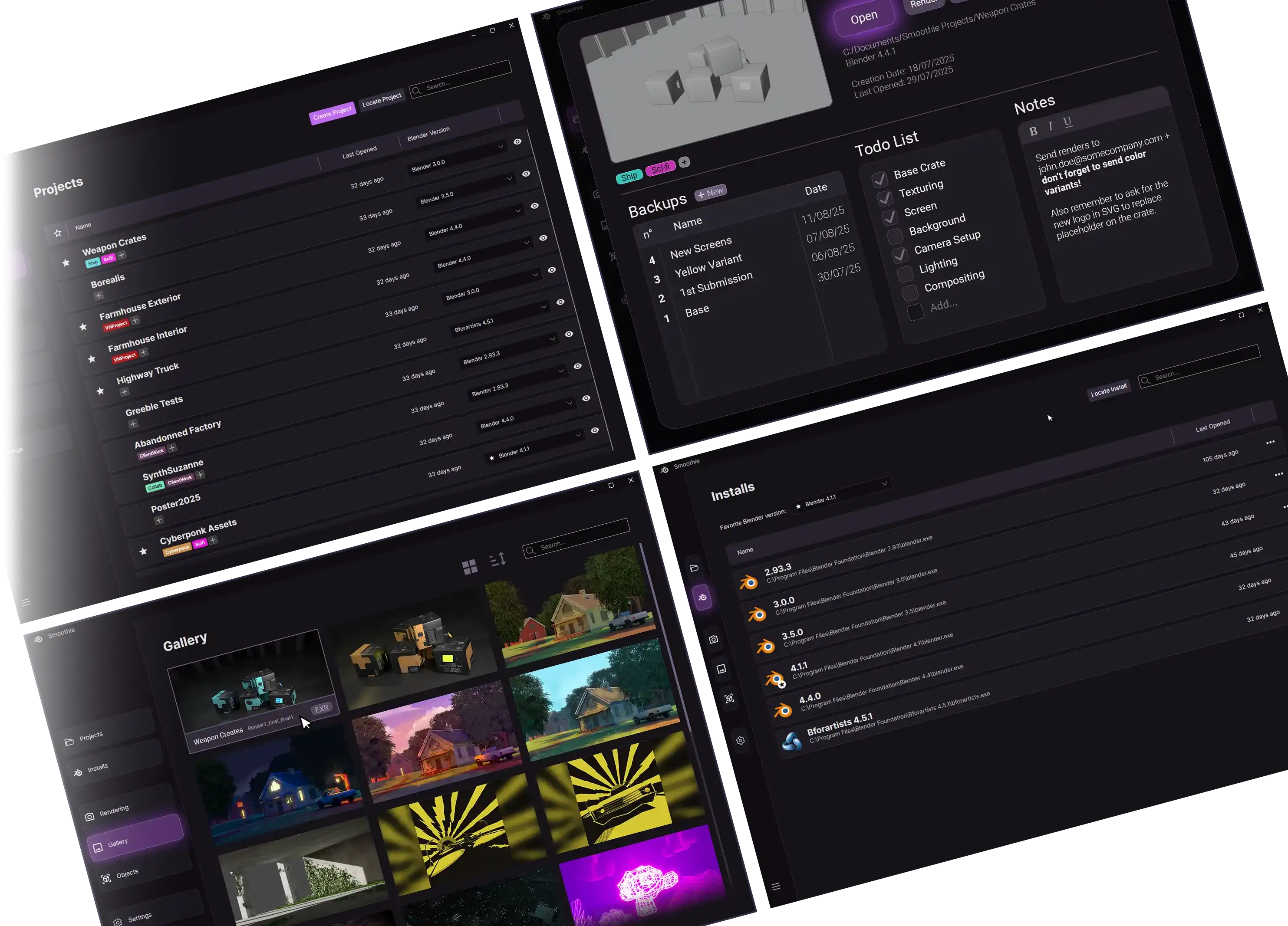 Smoothie is a tool for Blender artists of all levels, allowing them to easily and quickly manage projects, image and video renderings, 3D objects, Blender updates, and much more.